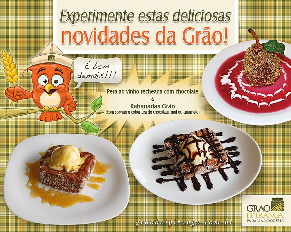 Venha experimentar estas deliciosas novidades da Grão: – Pera ao vinho recheada com chocolate. – Rabanadas Grão. Com sorvete e cobertura de chocolate, mel ou caramelo. Deliciosas opções para sua sobremesa!