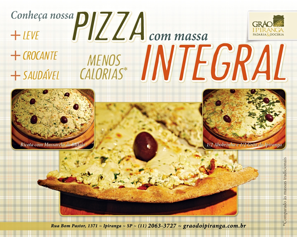 Experimente nossa pizza com massa integral. Mais leve, crocante e saudável, a massa integral oferece menos calorias do que a massa tradicional. Venha conferir!