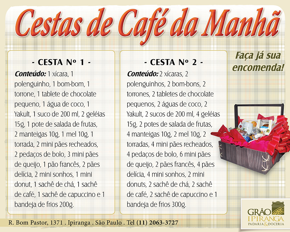 Presenteie a quem você ama com uma linda cesta de café da manhã! São diversos modelos para as ocasiões especiais. Faça já sua encomenda. (clique na imagem para ampliá-la e facilitar a leitura)