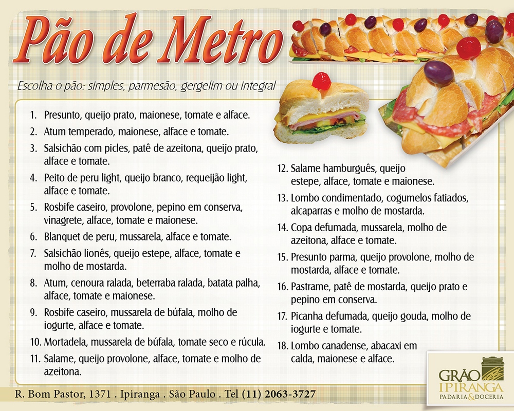 Escolha o pão de sua preferência: francês, caseiro, de forma ou baguetinha. Os sanduíches também podem ser servidos quente ou frio. Bom apetite! (clique na imagem para ampliar e facilitar sua visualização).