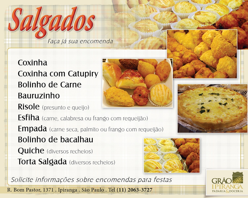 Produzidos diariamente, os salgados podem ser consumidos em nossa loja ou levados para sua casa. Você também pode fazer encomendas para sua festa. Informe-se (11) 2063-3727. (clique na imagem para ampliar)