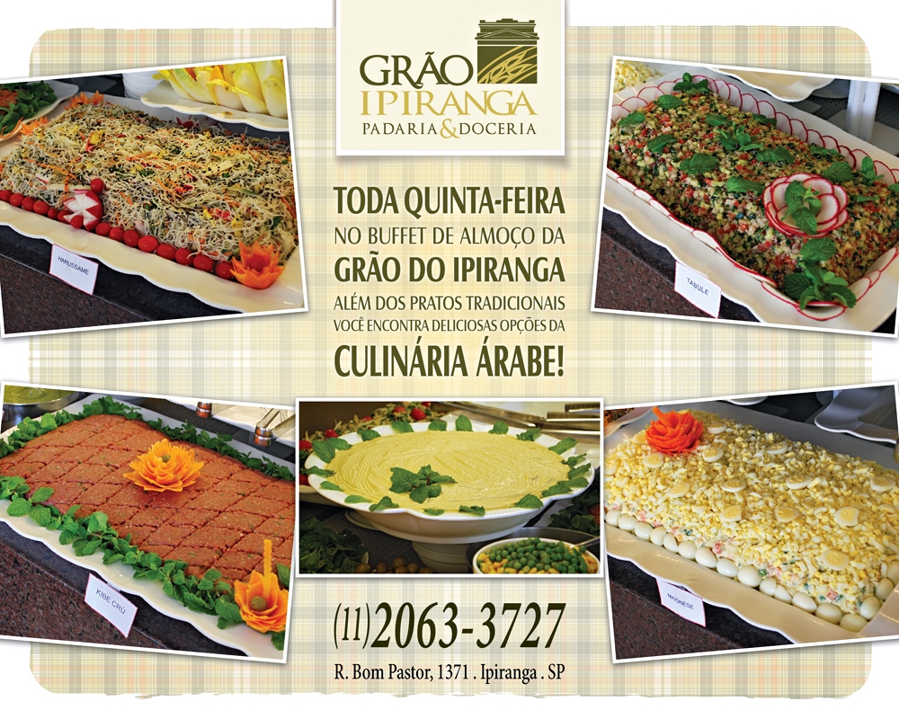 Agora, além dos pratos tradicionais, no buffet de almoço da Grão Independência você encontra delícias da culinária árabe: Tabule, Harussame, Kibe Crú, Homus, etc. Venha experimentar e saborear estas delícias, toda quinta-feira.